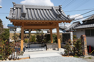 | 山 門 江戸期に建立されたと伝わる医薬門。表通りから美しく見える工夫が施されている。また外壁には門跡寺院に許可された五条壁が連なる。 |